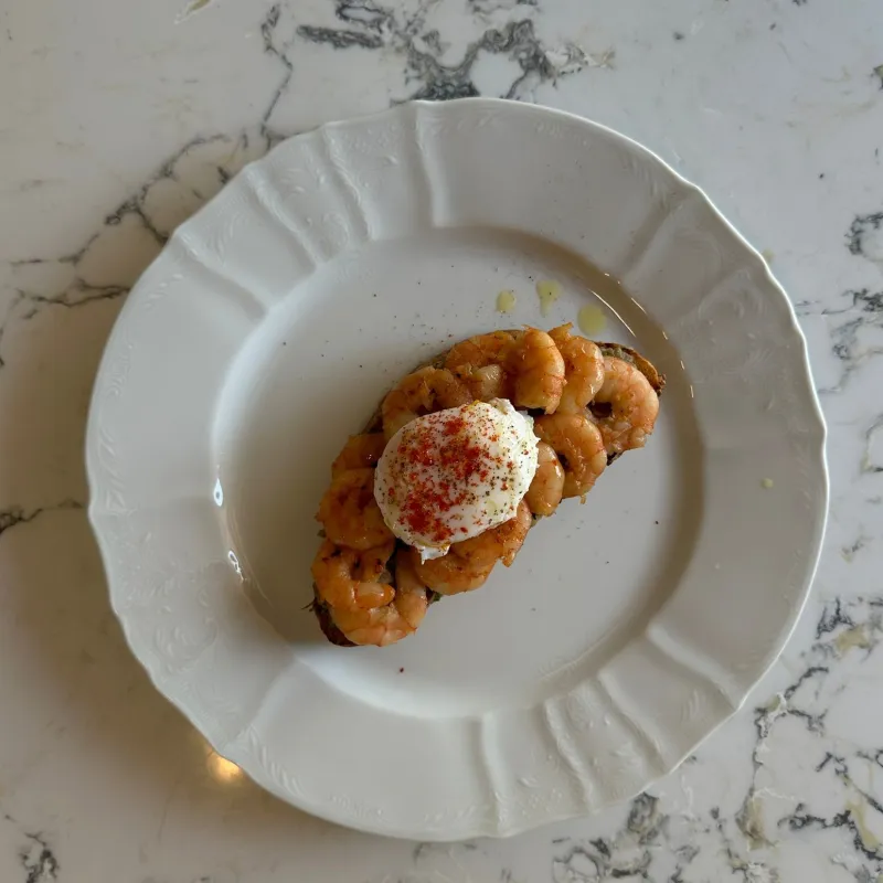 (тост, гуакомоле, помидоры, креветки, яйцо, зелень)