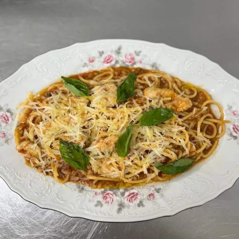 (спагетти, томатный соус, куриное филе, зелень)