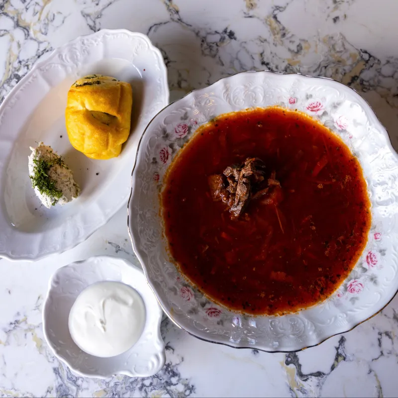 (морковь, лук, перец, свекла, капуста, картофель, говяжьи щеки, пампушка, сметана)