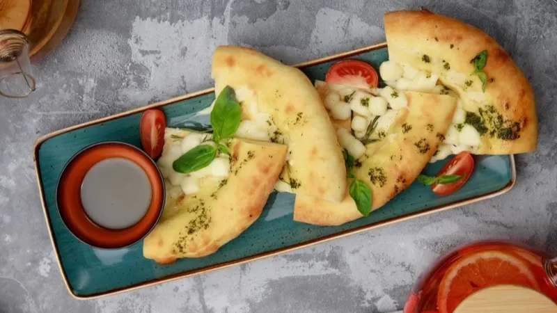 Фирменное итальянское тесто со свежайшей домашней брынзой, томатом, розмарином и соусом песто