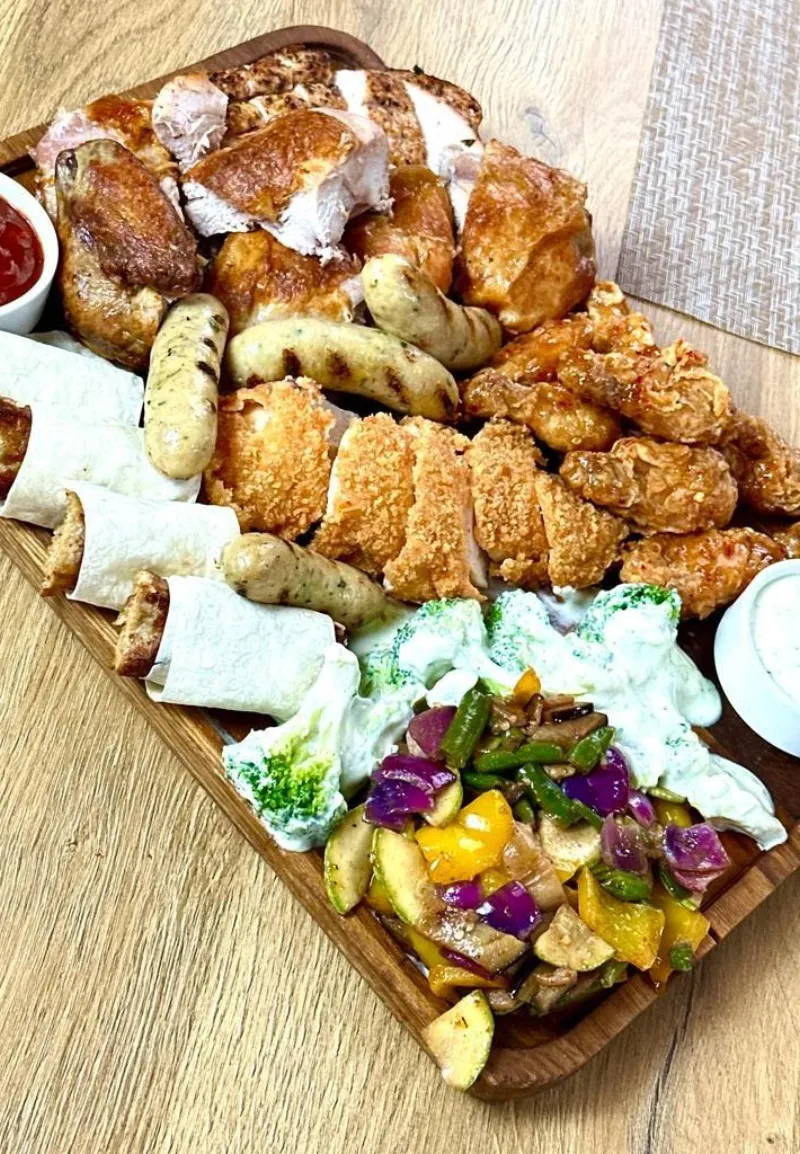 Состав: цыпленок гриль, куриная грудка в панировке, куриные колбаски,утка , люля-кебаб куриный, гарнир: дольки картофеля, овощи рататуй, соус "BBQ",тар-тар