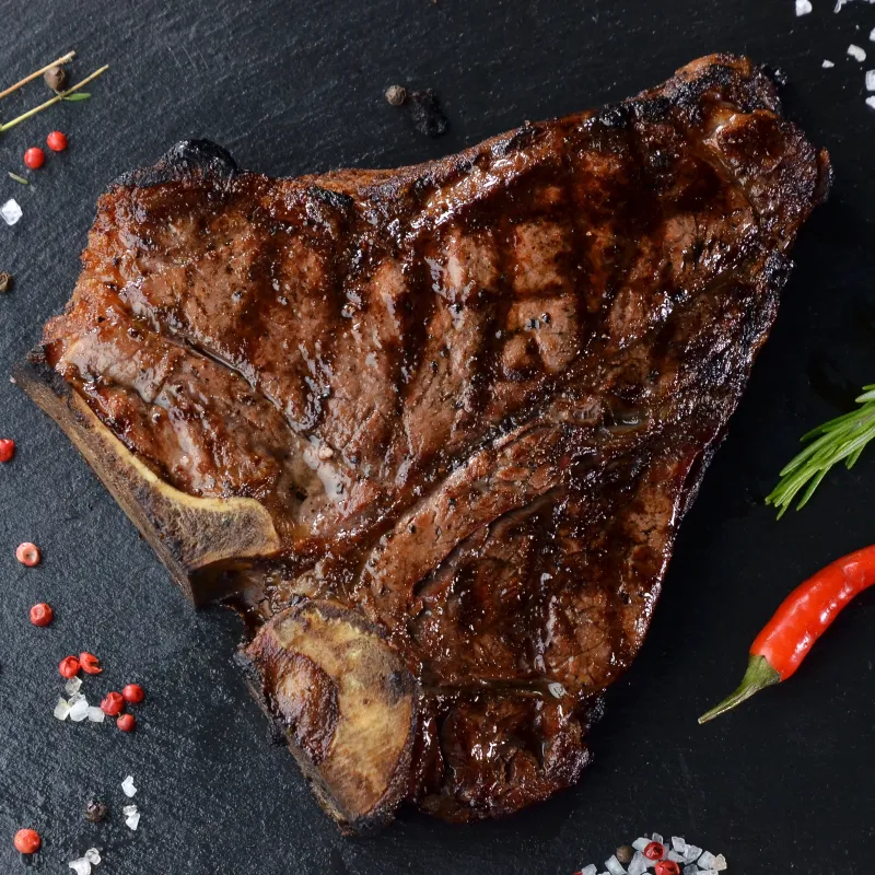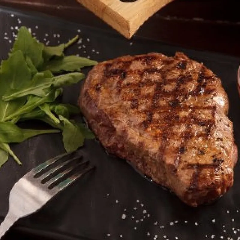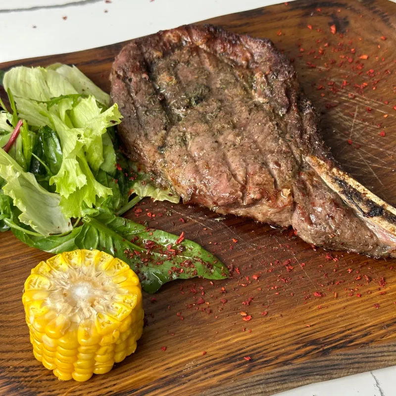 Состав: мясо на косточке, кукуруза на гриле, перечный соус, микс салата с черри.