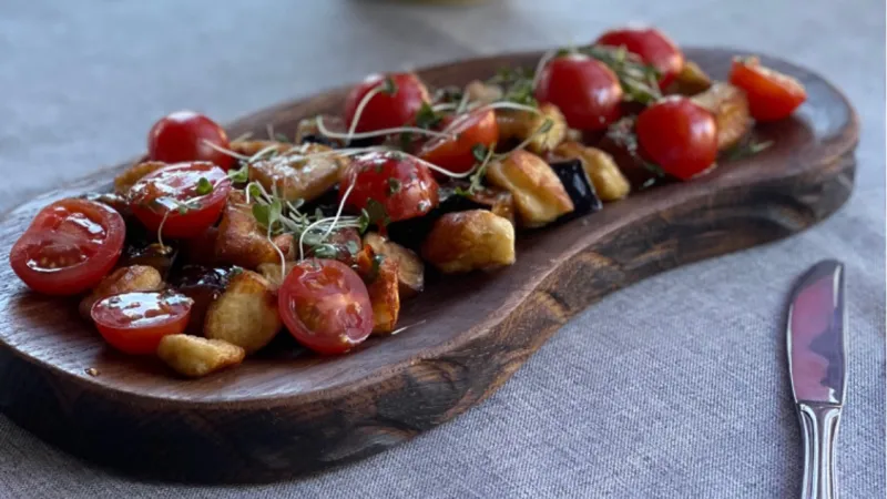 Обжаренные баклажаны с сыром халуми, кинзой, помидорами Черри и соусом Свит Чили(кисло-сладкий соус)