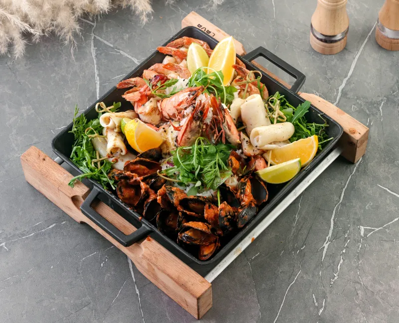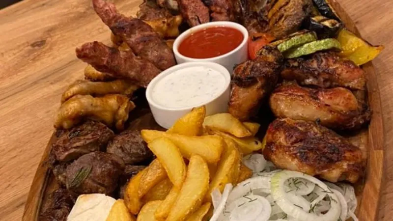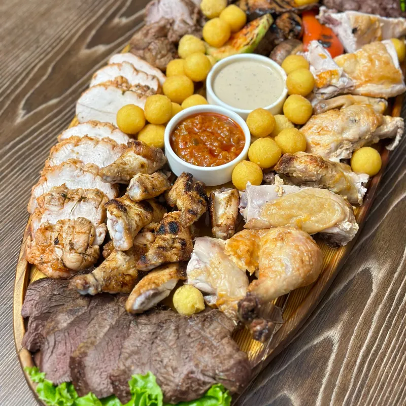 Состав: стейк из говядины, стейк из баранины, цыплёнок табака, стейк из индейки, куриные крылышки, овощи гриль, соус перечный и соус сальса, картофельные шарики