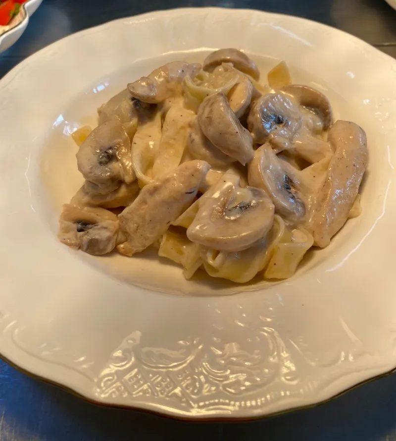 Феттучини,грибы шампиньоны,филе цыпленка,сливки,сыр пармезан