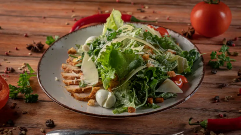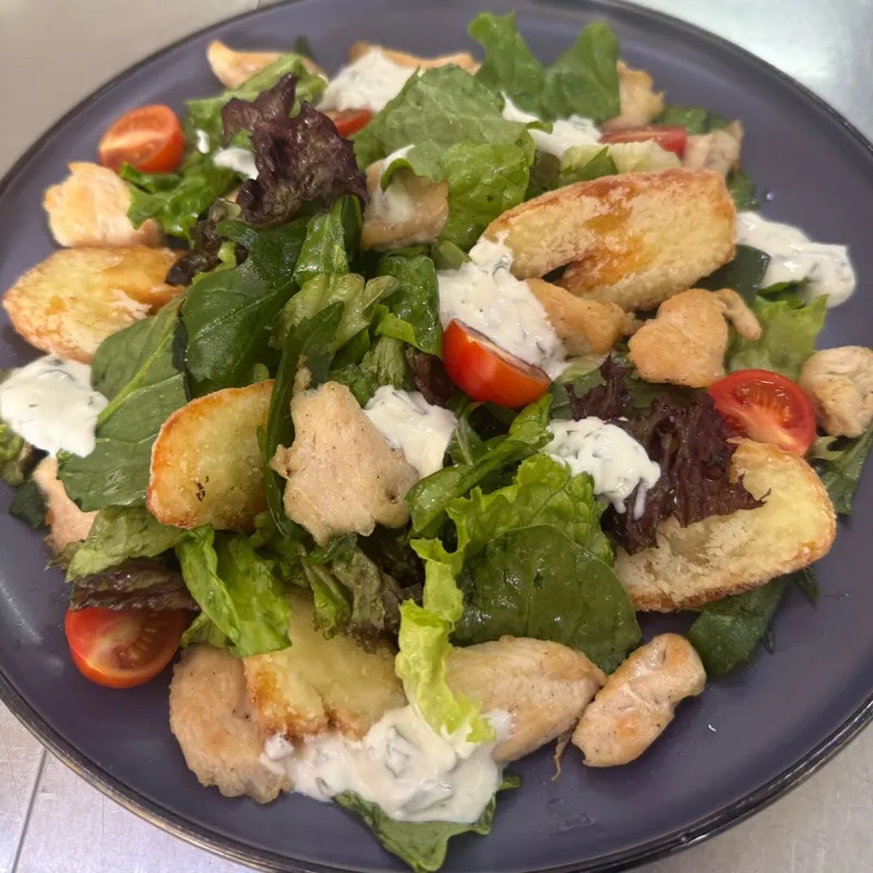 Состав: куриная грудка на гриле, крутоны, микс салата, черри, перепелиные яйца