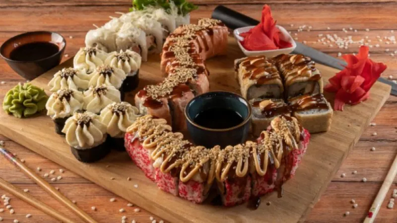 Сет "Выходной" -50шт -Поцелуй гейши 10 шт -Сенсей 10 шт -Филадельфия запеченная 10 шт -Хот Американо 10 шт -Калифорния с лососем 10 шт