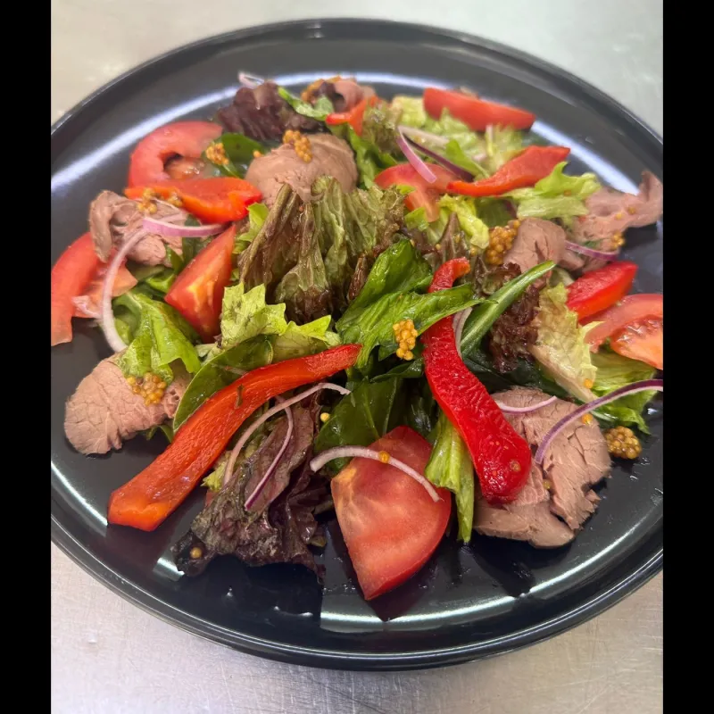 Состав: филе телятины, кукуруза, перечный соус, микс салата с черри