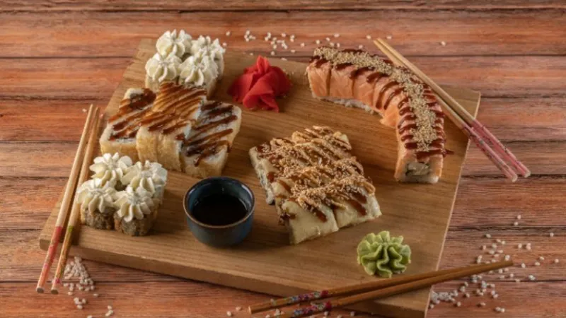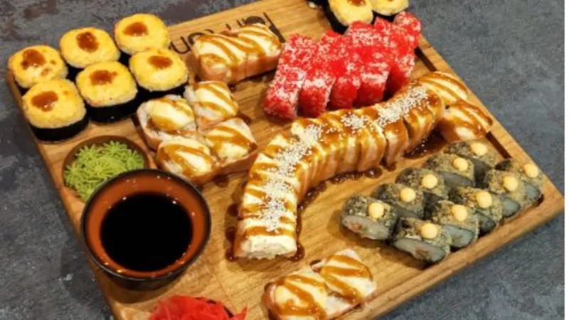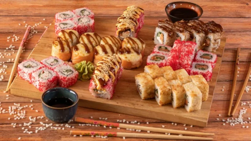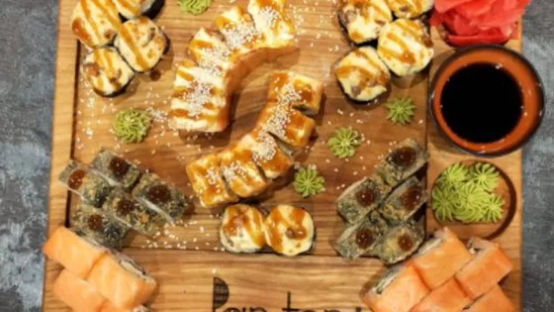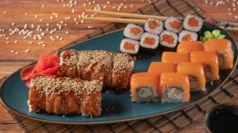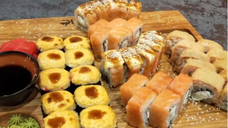 -ролл Бонито(холодные) -калифорния с крабом(холодные) -калифорния с лососем(холодные) -лосось темпура(жареные) -филадельфия(запеченная) -якитория острая(горячие)