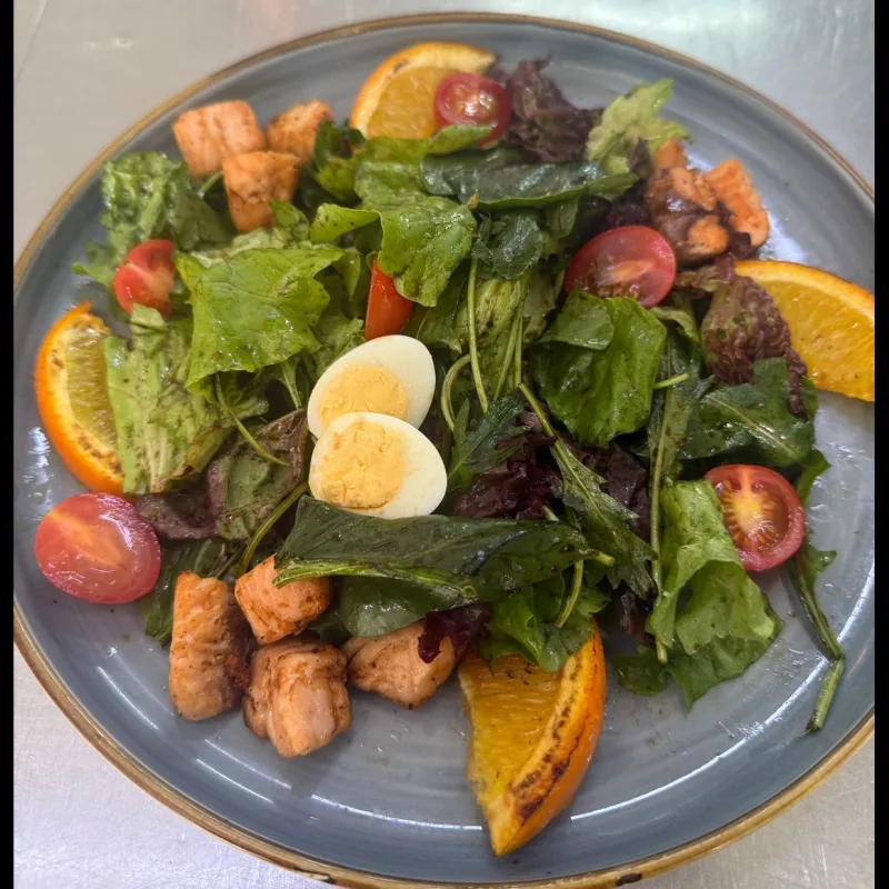 Филе семги,апельсиновые дольки,помидоры черри,перец светофор,яйцо перепелиное,кунжут,масло оливковое,бальзамический соус