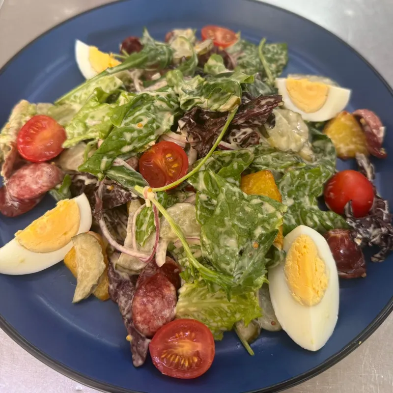 Колбаски охотничьи,картофель,микс салата,яйцо куриное,карнишоны маринованные,помидоры черри,лук красный,мед,майонез