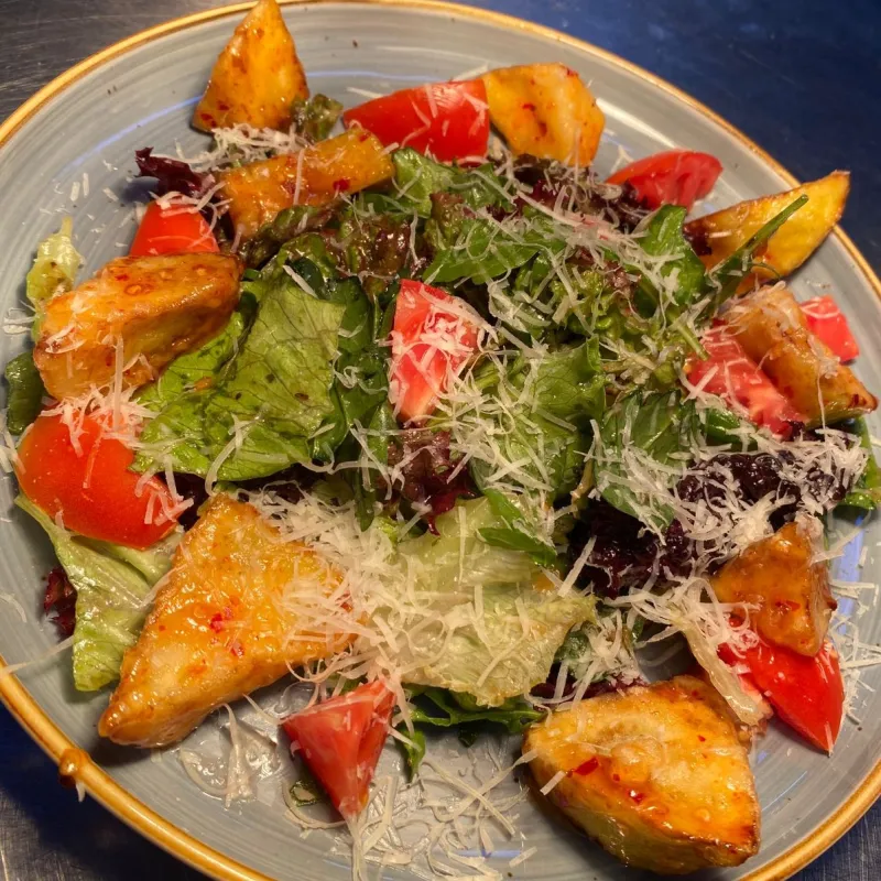 Состав: -жареные баклажаны -пармезан -помидоры -листья салата - Соус свит чили