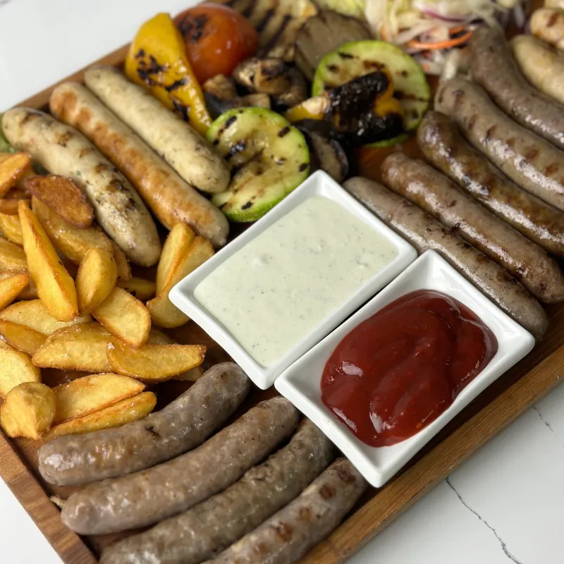 Состав: 5 видов колбасок собственного приготовления, горчица, соус BBQ, картофельные дольки, овощи гриль, квашеная капуста.