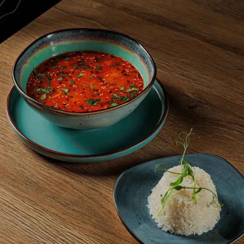 Состав: рыбный бульон, паста "Том ям", кокосовое молоко, морепродукты, шампиньоны, зелень