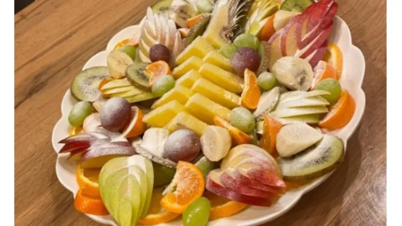 Состав: яблоки, груши, ананас, апельсины, мандарины, киви, бананы, виноград, мята, сахарная пудра