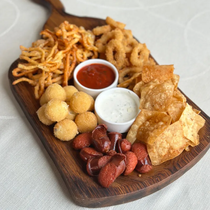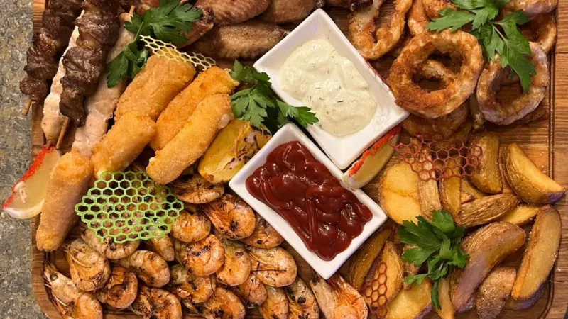 Жареный чечел, сырные шарики, охотничьи колбаски, чипсы из лаваша, кальмар в панировке, соус красный, соус тар-тар