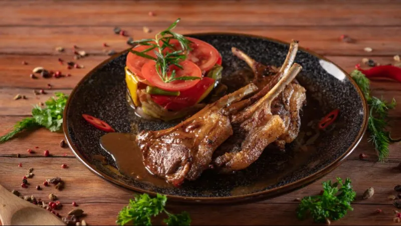 Состав: каре ягненка, овощи Рататуй, соус, специи, пряные травы