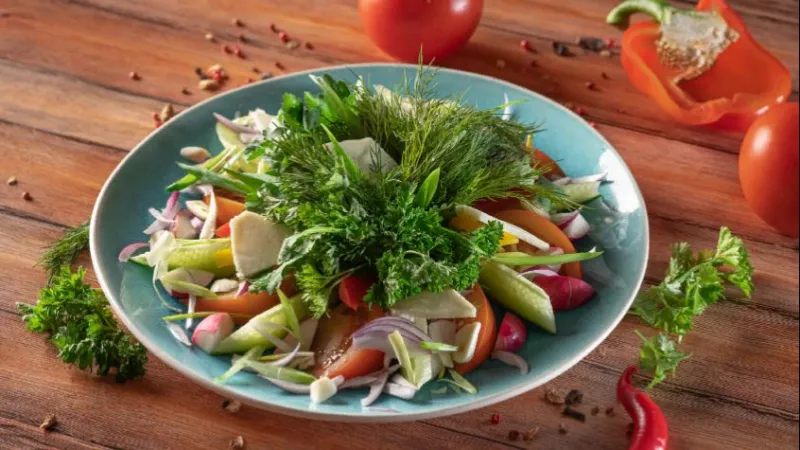 Состав: помидоры, огурцы, перец светофор, чеснок, красный лук, редис, петрушка, укроп, оливковая заправка