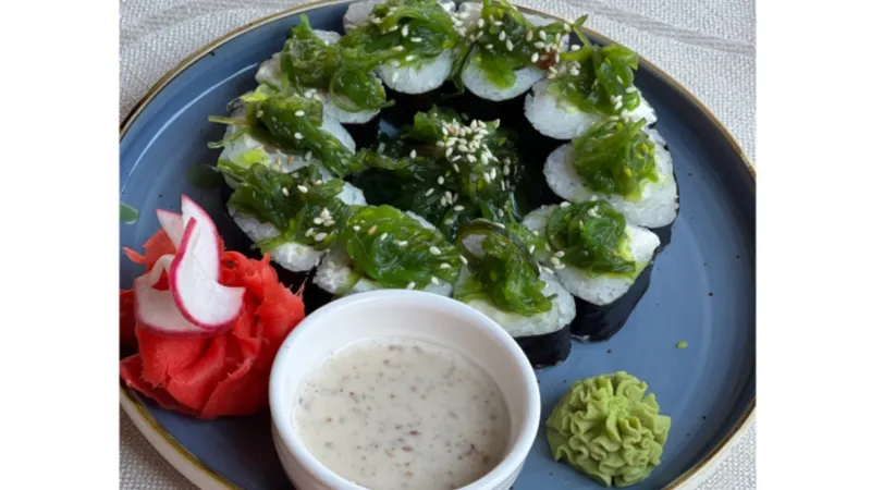 Холодный ролл с креметто и салатом Чукка, с ореховым соусом