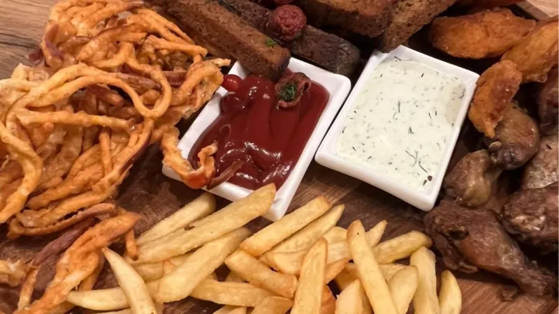 Состав: -наггетсы - картофель фри -жареный чечил -куриные крылышки -гренки с говяжьими колбасками - кетчуп, тар-тар