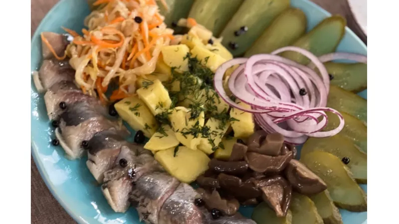 Картофель,маринованные огурцы , маринованные грузди, сельдь, квашеная капуста и красный лук,гренки