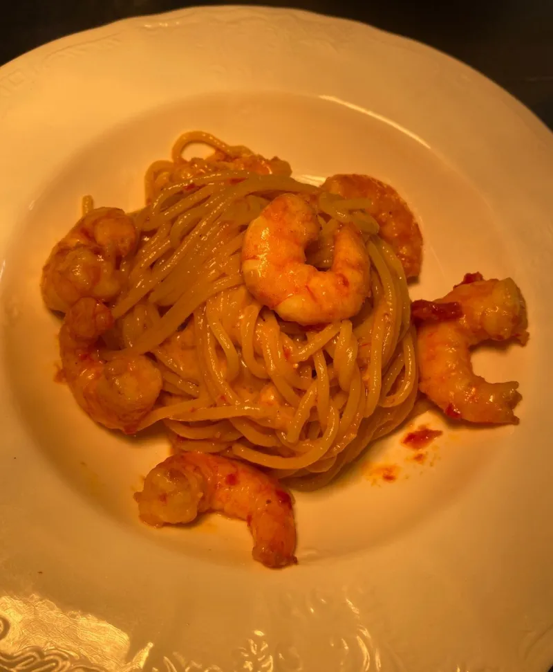 Спагетти Италия,креветки тигровые,сыр пармезан,песто красное,вяленые помидоры черри,масло оливковое
