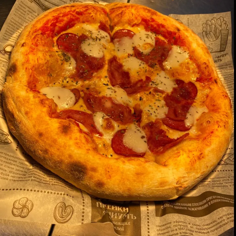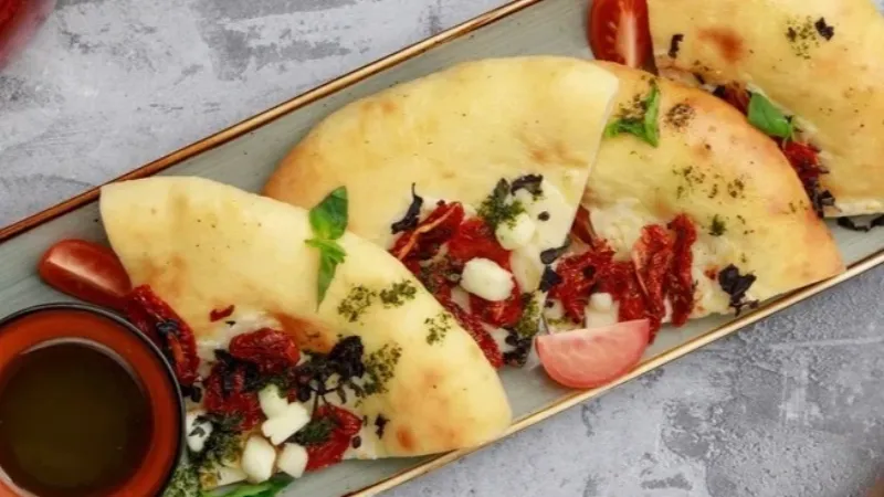 Фирменное итальянское тесто с домашней брынзой, вкуснейшими вялеными томатами, свежим базиликом и соусом песто