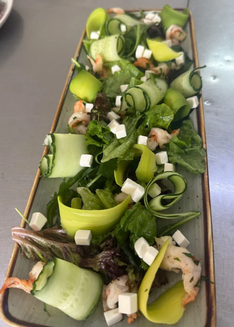 Тигровые креветки,микс салата,авокадо,сыр фетакса,огурцы свежие,масло оливковое