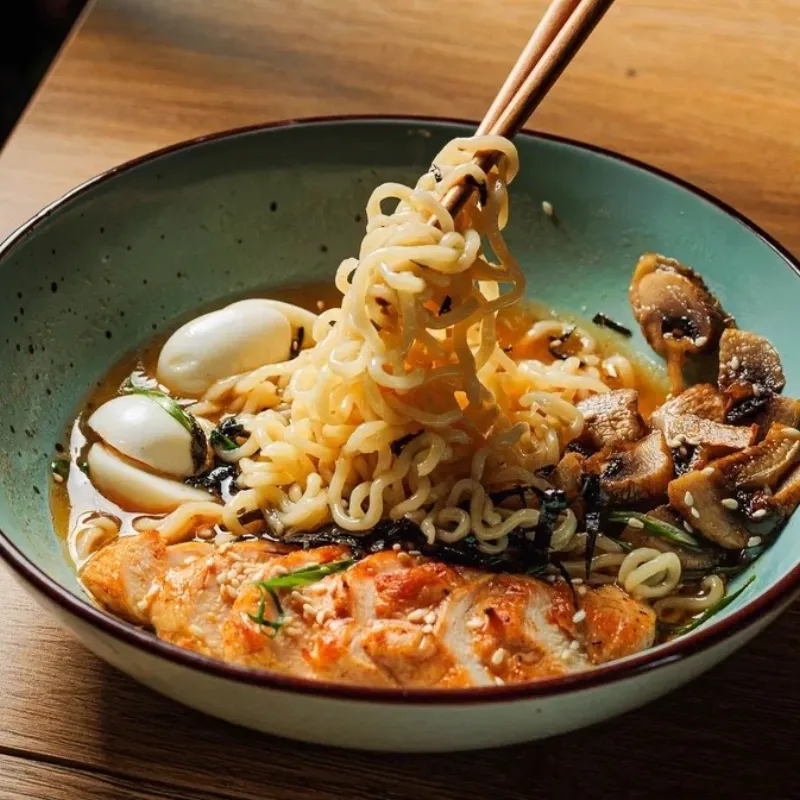 Состав: грибы шампиньоны, лапша рамен, нори, соевый соус, филе куриное, яйцо перепелиное, лук зеленый