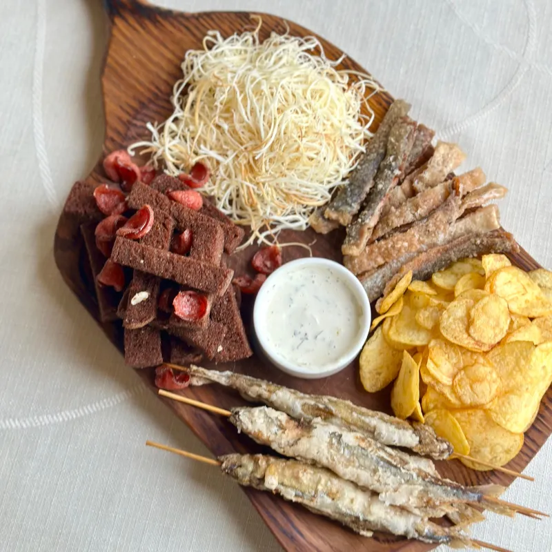 Жареная мойва, salmon skin, чечел, чипсы, чесночные гренки, соус тар-тар