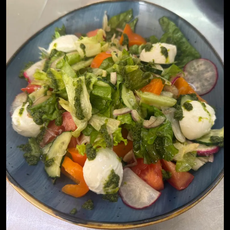 Огурцы свежие,помидоры свежие,айсберг,лист салата,перец светофор,редис,лук красный,сыр моцарелла,соус песто