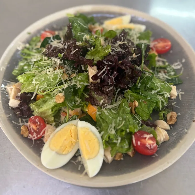 Микс салата,яйцо куриное,филе куриной грудки,грецкий орех,помидоры черри,микс сыра,масло оливковое