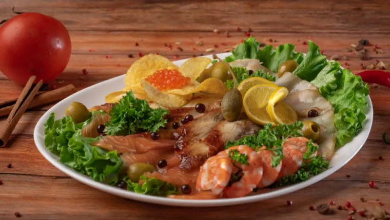 Состав: лосось, белорыбица, маринованный угорь, креветки, икра кеты, оливки, чипсы, зелень