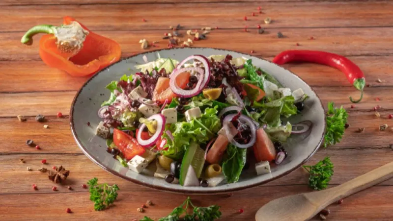 Состав: -сыр брынза -перец -помидоры -маслины -огурцы -оливки -листья салата -бальзамический жемчуг -красный лук