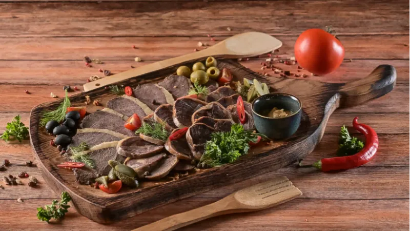 Состав: жая, казы, говяжий язык, овощи, зелень, горчица, оливки и маслины