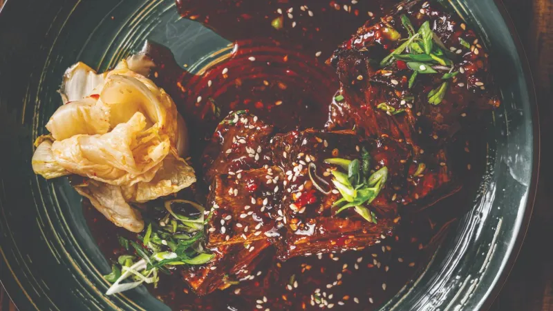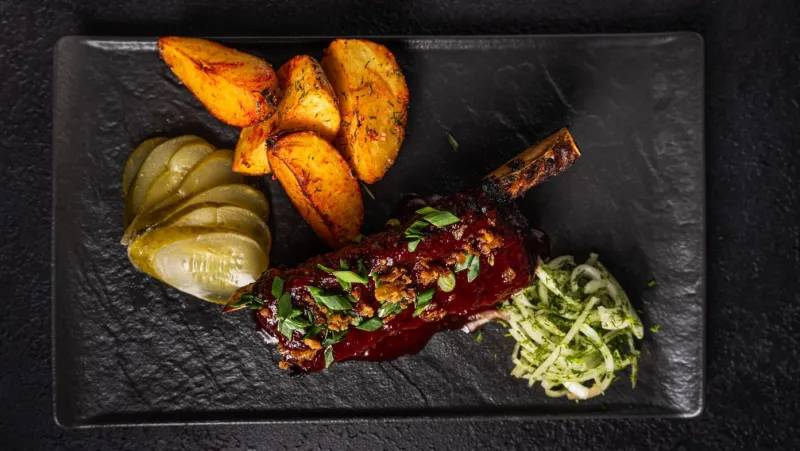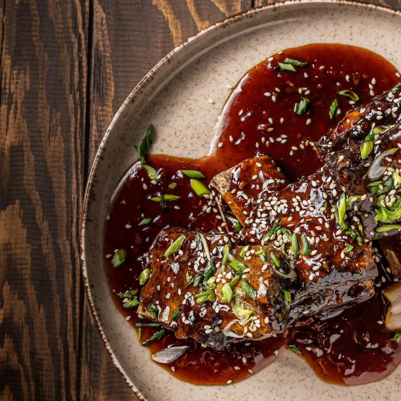 Томленые говяжьи ребра, не путайте с вареными, запекаются под соусом Colla-Cherry.