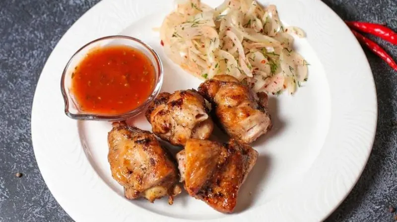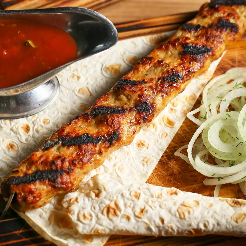 Подаются с маринованным луком и шашлычным соусом.