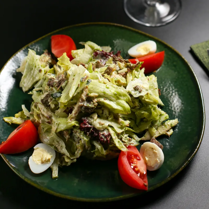 Айсберг, лола россо, помидоры черри, огурцы, перепелиные яйца, говядина отварная и куриное филе заправленное горчичным соусом.