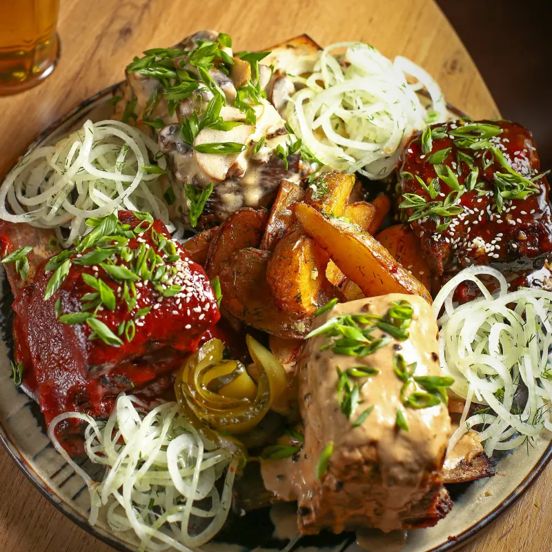 4 вида ребер: Ребро «Джеки чан», ребро «Colla cherry”, ребро с перечным соусом и ребро в сливочно-грибном соусе. Подается с маринованным луком и запеченным картофелем.