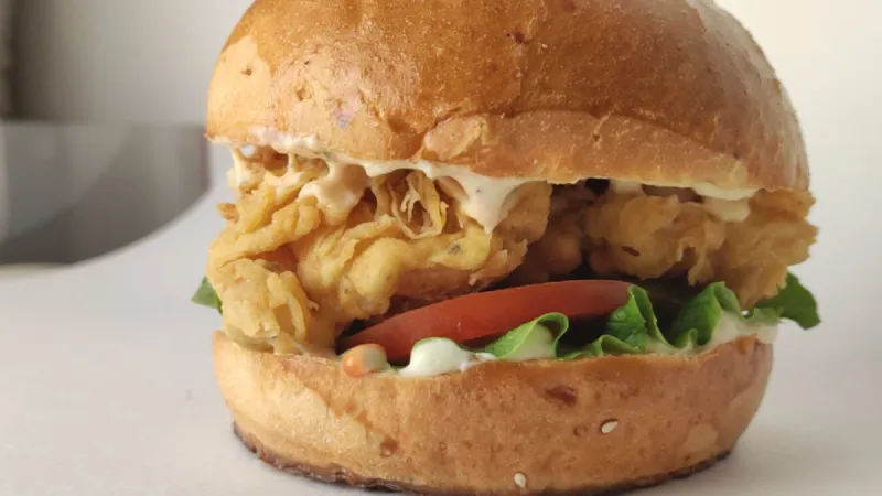 Соус тар-тар, Кетчуп , лист салата, соус медово–горчичный , огурцы солёные свежий помидор, куриное филе в хрустящем кляре,булочка собственного приготовления.