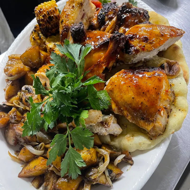 Маринованный цыпленок в кисло-сладком соусе. Подается с картофелем по-домашнему, со свежим салатом, кукурузой и лепешкой Пита и с соусами демигласс, сальса из запеченных овощей и свит Чили соус