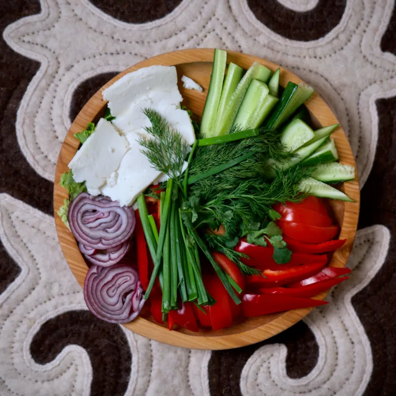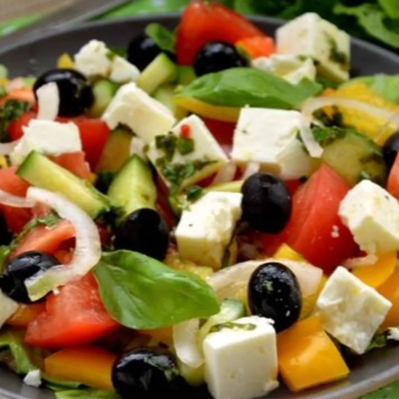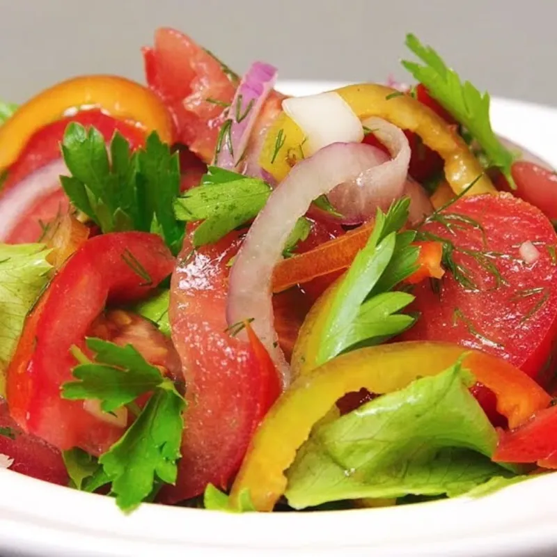 Салат из свежих овощей и листьев салата. На ваш выбор заправляется оливковым маслом или сметаной.