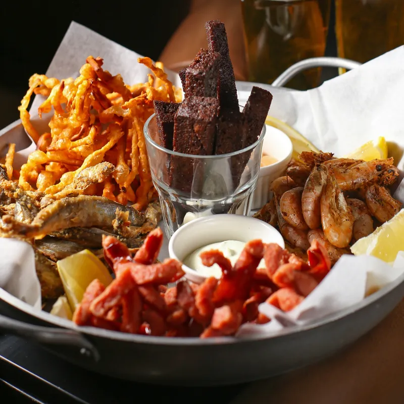 Пивные креветки, жаренная мойва, колбаски гриль, жаренный чечил и чесночные гарлики