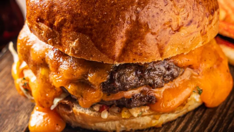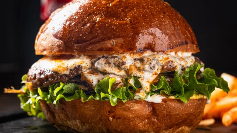 Томленное реберное мясо, салат айсберг, соус айоли, соус чипотле, сыр чеддер , котлета приготовленная на углях, перец маринованный , булочка собственного приготовления