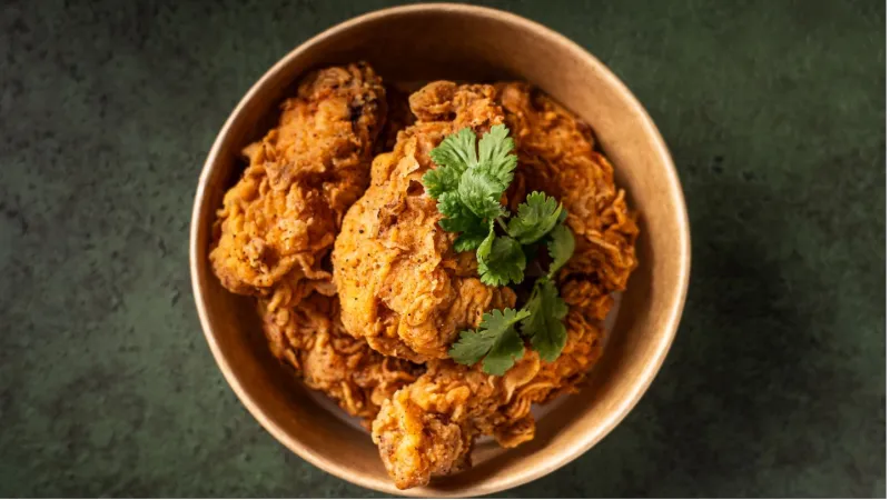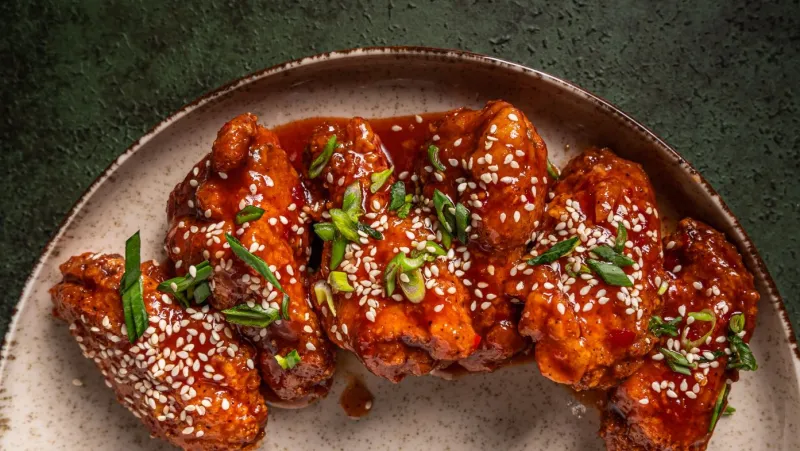 Жареные куриные крылышки, сдобренные фирменным соусом BBQ на основе вишневого пюре.