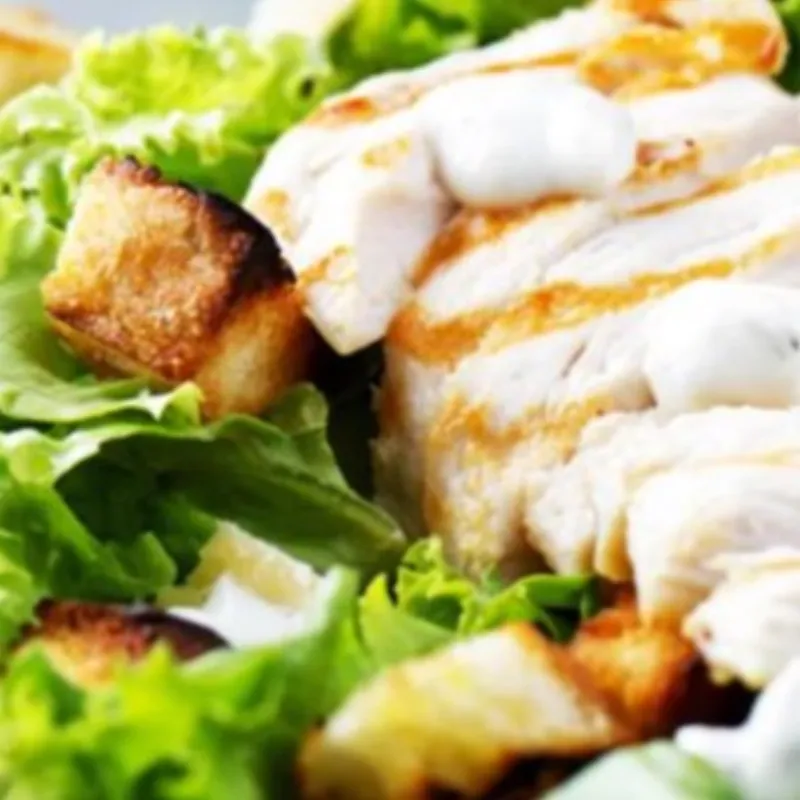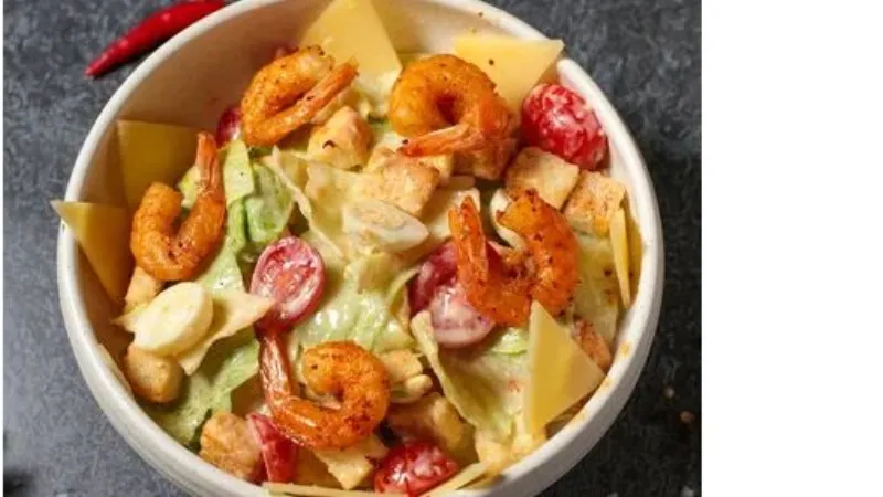 Микс салата заправленный классическим соусом Цезарь с тигровыми креветками.