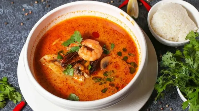 Насыщенный рыбный бульон с морепродуктами и грибами, подается с рисом и лаймом.