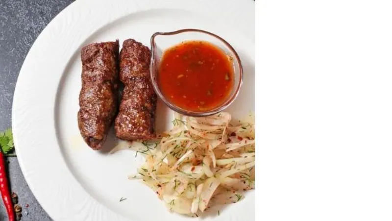 Подаются с маринованным луком и шашлычным соусом .