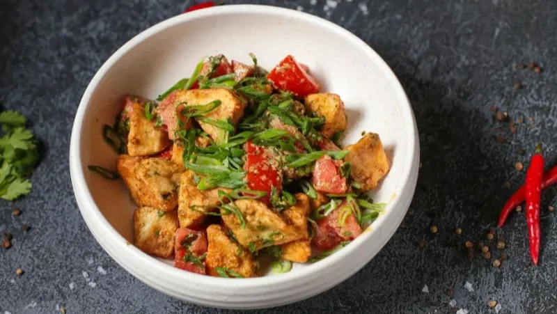Баклажаны обжаренные в хрустящей корочке, свежие томаты, заправляются ореховым соусом.