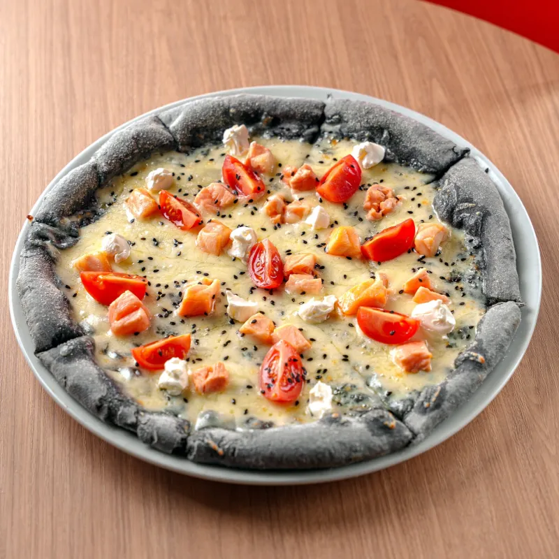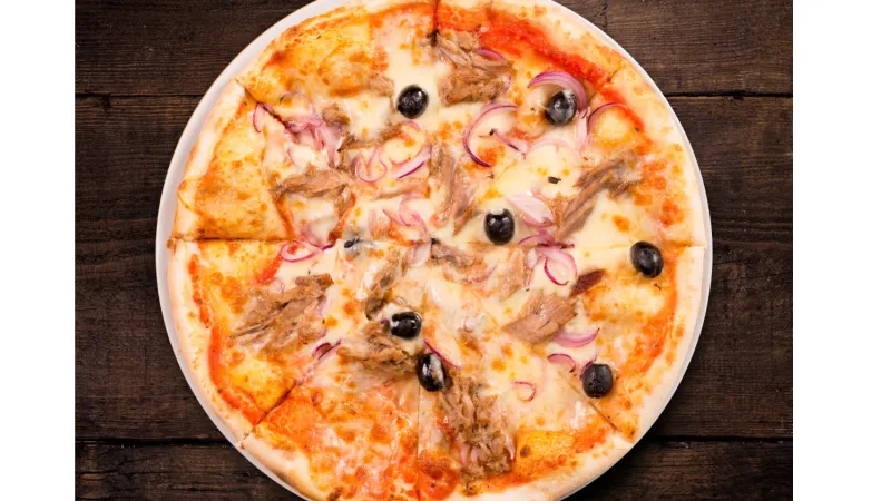 Пицца соус, проволоне, тунец, красный лук, маслины